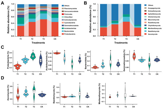 To better understand the impact of the three treatments on the microbial community structure and composition, we conducted a statistical analysis for the top ten most abundant bacterial and fungal phyla (Figure 2). The bar plot histograms were generated to reveal the classifications of abundant ASVs of bacteria (Figure 2A) and fungi (Figure 2B) at the phylum level. Bacterial phyla such as Proteobacteria, Acidobacteriota, Bacteroidota, and Gemmatimonadota dominated the soil bacterial communities with a relative abundance (RA) of 67.4%, 74.4%, 81.5%, and 74.8% in T1, T2, T3, and CK, respectively (Table S3). Proteobacteria and Bacteroidota were found in low RA in the rhizosphere soil of T1 compared with T2, T3, and CK. In contrast, there were several phyla, such as Acidobacteriota and Gemmatimonadota, that were present in high RAs in the rhizosphere soil of T1 than T2, T3, and CK (Figure 2C). Fungal phyla such as Ascomycota, Basidiomycota, and Mortierellomycota dominated the soil fungal communities, and their RA accounted for more than 99% in T1, T3, and CK except for T2 (98.76%) (Table S4). Fungal phyla such as Basidiomycota and Mortierellomycota exhibited lower relative abundances in T1 compared to other treatments and CK. Further, T1 demonstrated a significantly reduced RA of Ascomycota compared to T2 and T3 (Figure 2D).
