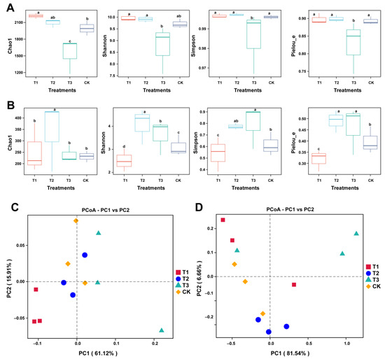 Assessment of microbial community diversity and structure difference under different treatments. Box plot showing the alpha diversity indices of bacterial (A) and fungal (B) communities under different treatments. Alpha diversity indices include Chao 1, Shannon, Simpson, and Pielou evenness. Different lowercase letters on each box plot represent the significant differences among treatments according to the Wilcoxon test at p < 0.05. Principal coordinate analysis (PCoA) based on the Bray–Curtis distance matrix demonstrates the separation between soil bacterial and fungal communities under different treatments. PCoA for bacterial (C) and fungal (D) communities. Application of SCZFN (T1), application of Bacillus subtilis wettable powder (T2), application of fungicide Apron Advance (T3), and application of water (CK).