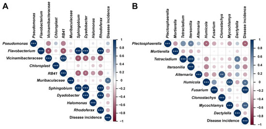 Correlation analysis between Top 10 bacterial-fungal genera and disease incidence according to Pearson correlation coefficient (PCC, p < 0.05). PCC between bacterial genera and disease incidence (A), and PCC between fungal genera and disease incidence (B). Asterisks indicates significant differences (* p < 0.05; ** p < 0.01; *** p < 0.001).
