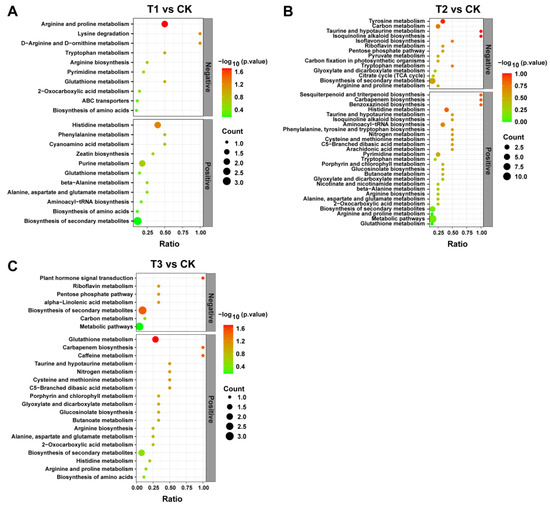 Analysis of KEGG enrichment pathway between treatments compared to CK in two ion modes (A–C). The horizontal coordinate is the ratio of the number of differentiated metabolites in the corresponding metabolic pathway to the total number of identified metabolites in the pathway, and the vertical coordinate represents the difference in significance level (−log10(p-value)). The size of the dots represents the number of differentiated metabolites in the corresponding pathway. Application of SCZFN (T1), application of Bacillus subtilis wettable powder (T2), application of fungicide Apron Advance (T3), and application of water (CK).