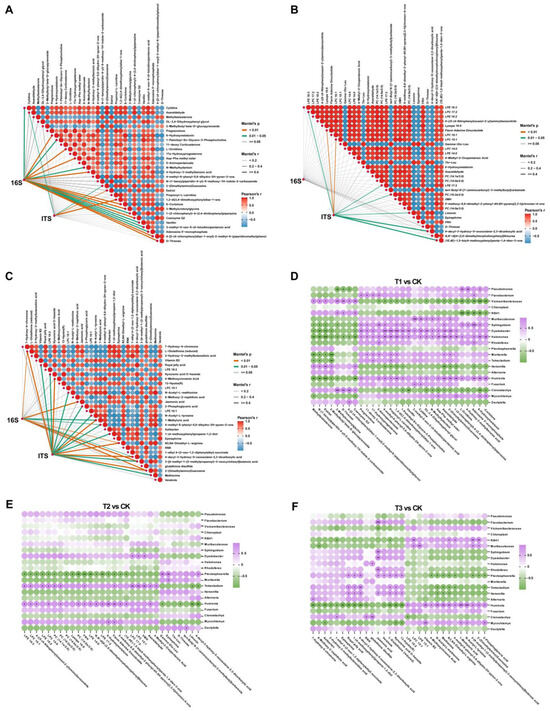 Interactions between different expressed metabolites and differential microbial communities with different treatments compared to CK. The interactions among the top 30 distinct metabolites (The top 15 of each of the two ion modes) and diverse microbial communities were compared to CK under various treatments. (A–C) Correlations of the microbial community and top 30 DEMs were determined using the Mantel test. (D–F) Correlations analysis of the Top 10 bacterial-fungal genera and Top 30 DEMs according to Pearson correlation coefficient. Asterisks indicates significant differences (* p < 0.05; ** p < 0.01; *** p < 0.001). Application of SCZFN (T1), application of Bacillus subtilis wettable powder (T2), application of fungicide Apron Advance (T3), and application of water (CK).