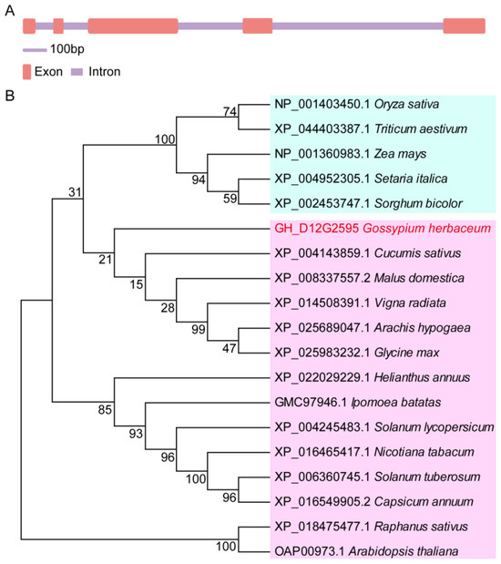 Gene structure and phylogenetic analyses of GhSWEET42. (A) The intron–exon structure of GhSWEET42 is depicted, with exons represented by red lines and introns by purple lines. (B) Phylogenetic analysis of GhSWEET42, along with 18 homologous SWEET proteins in different species. GhSWEET42 is highlighted in red.