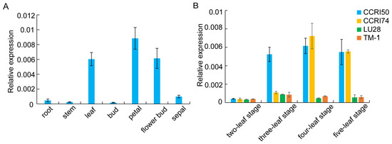 Leaf blades from CCRI50, CRRI74, Lu28, and TM-1 were sampled at the 2-, 3-, 4-, and 5-leaf stages to analyze the GhSWEET42 expression patterns across different growth stages. For the tissue-specific expression analysis, roots, stems, leaves, buds, flower buds, petals, and sepals were harvested from CCRI50. Each sample included three biological replicates. All the samples were immediately frozen in liquid nitrogen and stored at −80 °C for the subsequent total RNA extraction.