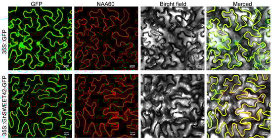 Subcellular localization of GhSWEET42 in tobacco leaves. Scale bar = 20 μm. GhSWEET42-GFP fusion protein localized in the plasma membrane. NAA60 is a cell membrane marker.
