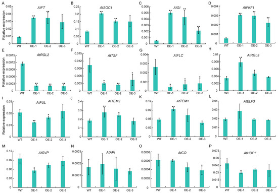 To elucidate the regulatory interactions between GhSWEET42 and various flowering-time regulators, the expression of 16 major flowering genes was quantified in the WT and GhSWEET42-OE lines under LD conditions. The GhSWEET42-OE lines exhibited a significant upregulation of the positive flowering regulators AtFT, AtSOC1, AtGI, and AtFKF1 compared to the WT (Figure 5A–D). Conversely, the expression of the negative flowering regulators AtTSF, AtFLC, and AtRGL2 was significantly downregulated in the GhSWEET42-OE lines relative to the WT (Figure 5E–G). No significant variation in the expression levels of AtRGL3, AtFUL, AtTEM1, AtTEM2, AtELF3, AtSVP, AtAPI, AtCO, and AtHDF1 was observed between the GhSWEET42-OE lines and WT (Figure 5H–P). These data align with the early-flowering phenotype observed in the GhSWEET42-OE plants.