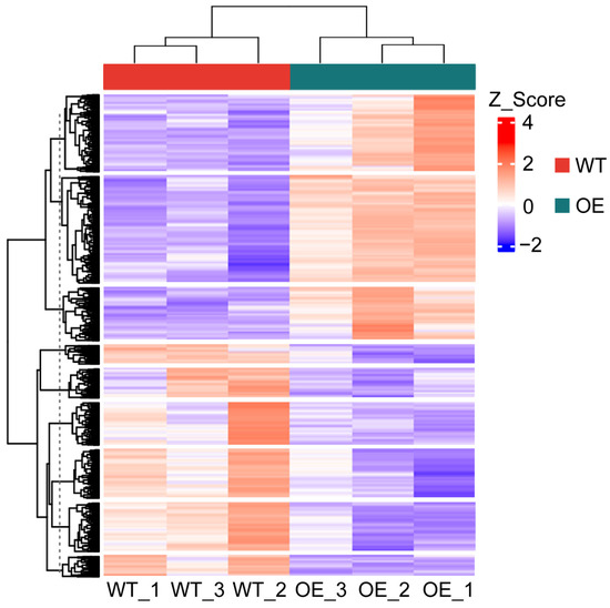 To elucidate the regulatory mechanisms of GhSWEET42, a transcriptome analysis of WT and GhSWEET42-OE plants was performed using RNA-Seq with three biological replicates per genotype. Post-filtering, a total of 40.29 Gb of clean data were obtained, with each sample yielding an average of 6.71 Gb. Clean reads comprised over 99% of the total reads per sample, with the majority (>97%) uniquely aligning with the Arabidopsis reference genome (Table 1). The percentage of Q20 bases and Q30 bases exceeded 97% and 93%, respectively, with a GC content of at least 45% (Table 1). Bidirectional clustering analysis of the differentially expressed transcripts revealed significant differences between the WT and transgenic Arabidopsis (Figure 6). The high quality of the sequencing data supports its use in the subsequent analyses.
