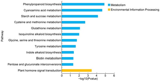 Additionally, the KEGG pathway analysis elucidated the functions of the DEGs, identifying significantly enriched pathways (p ≤ 0.05) within two major categories: metabolism and environmental information processing (Figure 8, Table S3). The metabolic category encompassed pathways such as phenylpropanoid biosynthesis (ath00940, 27 DEGs), cyanoamino acid metabolism (ath00460, 18 DEGs), starch and sucrose metabolism (ath00500, 31 DEGs), cysteine and methionine metabolism (ath00270, 21 DEGs), glutathione metabolism (ath00480, 17 DEGs), indole alkaloid biosynthesis (ath00901, 4 DEGs), glycine, serine and threonine metabolism (ath00260,12 DEGs), tyrosine metabolism (ath00350, 8 DEGs), indole alkaloid biosynthesis (ath00901, 2 DEGs), biotin metabolism (ath00780, 4 DEGs), and pentose and glucuronate interconversions (ath00040, 15 DEGs). The environmental information-processing category included the plant hormone signal transduction pathway (ath04075, 43 DEGs) (Figure 8, Table S3). These data suggest that variations in the metabolic and environmental information-processing pathways contribute to the differences in the flowering time between WT and transgenic Arabidopsis.