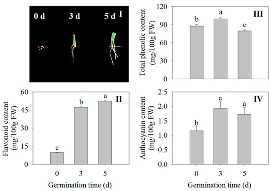 2.2. Effects of Germination Time on Morphology, Flavonoid Content, Total Phenolic Content, and Anthocyanin Content in Finger Millet Sprouts
