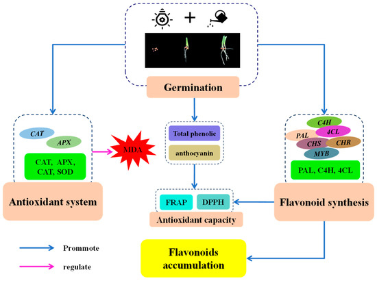 Chicago/Turabian StyleZhang, Jing, Jia Yang, and Yongqi Yin. 2024. "Germination Promotes Flavonoid Accumulation of Finger Millet (Eleusine coracana L.): Response Surface Optimization and Investigation of Accumulation Mechanism" Plants 13, no. 16: 2191. https://doi.org/10.3390/plants13162191
