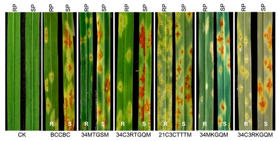 Infection types of PI 94701 and Rusty in response to Pgt races. Six Pgt races (BCCBC, 34MTGSM, 34C3RTGQM, 21C3CTTTM, 34MKGQM, and 34C3RKGQM) were used in this study, and their avirulence/virulence profiles are detailed in Table S1. Plants were grown in growth chambers at 22–24 °C with 16 h light/8 h dark. Seedlings at the three-leaf stage were challenged with a urediniospore/talc suspension using the shaking-off method [29]. RP, resistant parent; SP, susceptible parent; R, resistant; S, susceptible; CK, plants without inoculation.