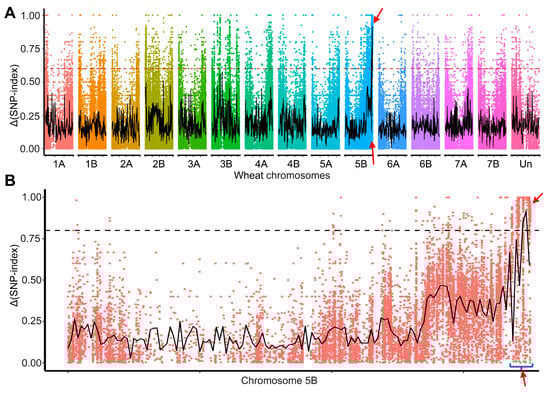 BSR-Seq analysis of SrPI94701. (A) Δ(SNP-index) was calculated for each SNP across all chromosomes. (B) Δ(SNP-index) were specifically calculated for each SNP on chromosome 5B. SNP-index plotting was conducted following a previously established protocol [30]. SNP index values in the resistant and susceptible pools were calculated using a custom Perl script, and the Δ(SNP-index) = |(SNP-index of the resistant pool) − (SNP-index of the susceptible pool)| was determined for each SNP. Sliding window analysis was applied to ΔSNP-index plots with a 5 Mb window size and a 50 kb increment. A total of 160 SNPs within the genomic region spanning from 673.5 to 699.9 Mb (Svevo Rel.1.0; Table S2) on chromosome arm 5BL showed significant association with the phenotype. The mapping region is highlighted by red arrows.