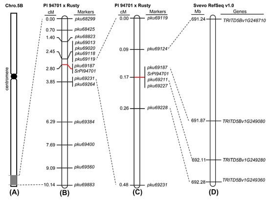 To verify the mapping location, we specifically selected SNPs surrounding the region of interest on chromosome arm 5BL and developed 14 5B-genome-specific Cleaved Amplified Polymorphic Sequence (CAPS) markers (Table 1). Subsequently, these markers were used to genotype the 143 F2:3 families, resulting in the construction of a genetic linkage map for SrPI94701 (Figure 3A,B). Based on the linkage results, SrPI94701 was found to be completely linked to marker pku69187 and mapped within a 1.4 cM interval flanked by markers pku69119 and pku69231 (Figure 3B).