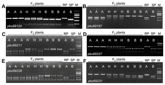 Genotypes of F2 plants derived from the PI 94701 × Rusty cross. F2 plants genotyped with (A) CAPS marker pku69124 (digested with SspI); (B) CAPS marker pku69187 (BbvCI); (C) CAPS marker pku69211 (HpyCH4IV); (D) CAPS marker pku69227 (PvuII); (E) CAPS marker pku69228 (Hpy188III); and (F) CAPS marker pku69231 (BtgI). PCR products were separated on agarose gels and stained directly with ethidium bromide. RP, resistant parent PI 94701; SP, susceptible parent Rusty; A, band corresponds to the resistant allele; B, band corresponds to the susceptible allele; H, heterozygous; M, DNA ladder.
