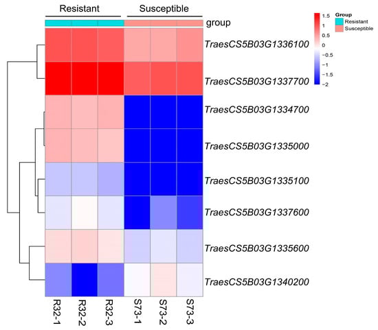 Transcript levels of the candidate genes were analyzed using RNA-seq data from the F4 sister lines S73 and R32, selected from the PI 94701 × Rusty cross. Given the identification of numerous NLR and kinase genes in the colinear regions of CS (Table S4), we focused on analyzing the 28 annotated genes within the candidate interval in CS. Among these candidate genes, eight exhibited differential expression between the Pgt-inoculated resistant and susceptible plants (Figure 5). Seven DEGs showed significant upregulation in R32 plants compared to S73 plants, whereas only one DEG displayed downregulation (Table S5). These upregulated DEGs included four NLR genes: TraesCS5B03G1334700, TraesCS5B03G1335000, TraesCS5B03G1335100, and TraesCS5B03G1335600, making them strong candidate genes.