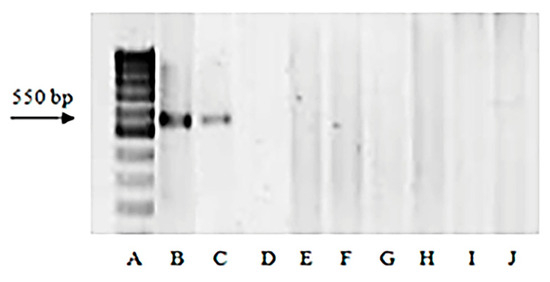 Amplificons of DNA marker SCS5550. (A) 100 bp DNA ladder; (B) bread wheat NIL Lr9; Aegilops biuncialis accessions resistant to Pt (C) k-2900; (D) k-1145; (E) k-2892; (F) k-2531; (G) k-2452; (H) k-3006; (I) k-4157; and (J) k-4195.