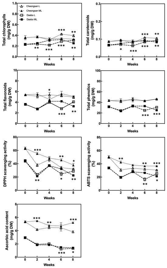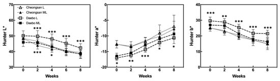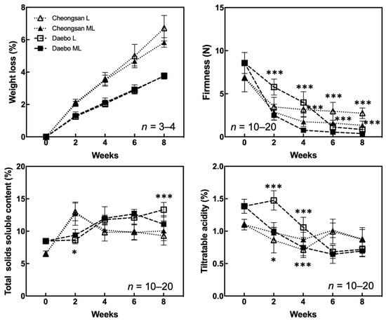 Figure 1. Changes in the physicochemical properties of the ‘Cheongsan’ and ‘Daebo’ hardy kiwi cultivars during cold storage. Weight loss, firmness, total soluble solids content, and titratable acidity were measured for 8 weeks. The asterisks indicate a significant difference for each cultivar between treatments L and ML according to Student’s t-test (* p < 0.05 and *** p < 0.001).