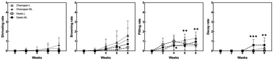 The ‘Cheongsan’ fruits in treatment L had a significantly lower titratable acidity (TA) than those in treatment ML for the first 4 weeks, while the TA of the ‘Daebo’ fruits in L gradually decreased for up to 4 weeks. Physiological disorders were apparent in the two cultivars in treatments L and ML for 8 weeks (Figure 2). The degree of shriveling, browning, pitting, and decay in the ‘Cheongsan’ and ‘Daebo’ fruits gradually increased throughout the 8-week experimental period. Specifically, the browning rate of the ‘Daebo’ fruits in treatment L was significantly lower than that of the fruits in treatment ML after 6 weeks of storage. Meanwhile, the pitting rates of the ‘Cheongsan’ and ‘Daebo’ fruits in treatment L were significantly higher after 6 and 4 weeks, respectively (Figure 2 and Figure 3). The decay rate of the ‘Daebo’ fruits in treatment ML significantly increased after 6 weeks.