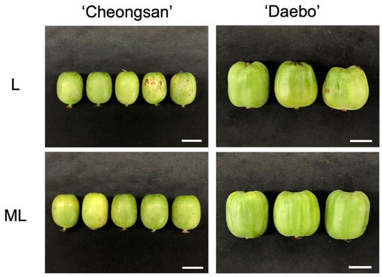 Chilling injury symptoms such as epidermis pitting, water-soaked and grainy tissue appearance, and lignification manifest during the cold storage of kiwifruit. The degree of these symptoms depends on the cultivar, stage of fruit maturity, and storage duration [12]. Specifically, genetic differences among fruit cultivars affect their response to cold stress by mediating metabolomic dynamics, antioxidant activities, and other physiological processes that contribute to fruit quality and storage life [13,14,15,16]. For example, Actinidia chinensis var. chinensis ‘Hongyang’ (a cold-sensitive cultivar) showed a higher chilling injury index with more lignified flesh tissue than ‘Xuxiang’ during cold storage at 0 °C [12]. The difference in cold injury between the two cultivars was dependent on the key enzyme activities involved in lignin synthesis. Additionally, variations in the metabolomic and transcriptomic characteristics in response to cold environments are involved in regulating the freezing tolerance of kiwifruit genotypes [15,17]. In this study, the differences in the responses of the ‘Cheongsan’ and ‘Daebo’ hardy kiwifruit cultivars to low-temperature storage were examined. The two fruit cultivars are phenotypically different based on their size (Figure 3); the fresh weight of ‘Daebo’ is approx. twice that of ‘Cheongsan’ [9]. We hypothesized that these two cultivars have distinguishable responsiveness to cold storage based on their genetic traits, which affect their physiological and metabolic properties during storage. Our results showed that the responses of the two cultivars to cold storage differed. Specifically, fruit weight loss increased dramatically in the ‘Cheongsan’ fruits compared with the ‘Daebo’ fruits, and differential changes in the other physicochemical properties were also observed during cold storage (Figure 1). Moreover, the incidence of physiological disorders, such as shriveling, browning, and pitting, was higher in the ‘Cheongsan’ fruits than in the ‘Daebo’ fruits regardless of the temperature (Figure 2). As the ‘Cheongsan’ and ‘Daebo’ fruits exhibited different characteristics during the cold storage period, it is reasonable to suggest that they have distinct genetic traits, including their size, in response to cold environments. Consequently, ‘Cheongsan’ appears to be a relatively cold-susceptible cultivar compared to ‘Daebo’. Although the specific genetic characteristics involved in the cold storage responses of ‘Cheongsan’ and ‘Daebo’ need further elucidation, it can be speculated that their genetic traits are associated with their different responses to cold storage conditions.