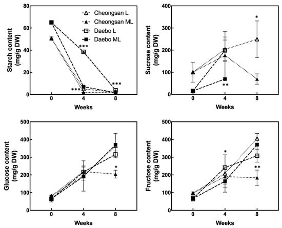 Figure 5. Changes in the starch and soluble sugar content in the hardy kiwifruits during storage. The asterisks indicate a significant difference for each cultivar between treatments L and ML according to Student’s t-test (* p < 0.05, ** p < 0.01, and *** p < 0.001; n = 3).
