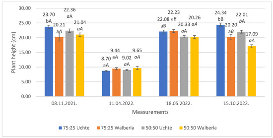 The average heights of the Festuca plants with the measurements. The letters indicate the significance levels, separated by measurement. ANOVA: 08 November 2021. By medium: 75:25: 0.021; 50:50: 0.121; by plant: ‘Uchte’: 0.096; ‘Walberla’: 0.583; 11 April 2022. By medium: 75:25: 0.088; 50:50: 0.274; by plant: ‘Uchte’: 0.213; ‘Walberla’: 0.750; 18 May 2022. By medium: 75:25: 0.840; 50:50: 0.911; by plant: ‘Uchte’: 0.011; ‘Walberla’: 0.010; 15 October 2022. By medium: 75:25: 0.001; 50:50: 0.000; by plant: ‘Uchte’: 0.006; ‘Walberla’: 0.006.