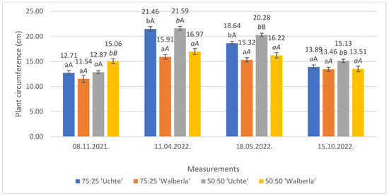The average circumferences of the examined plants. The letters indicate the significance levels, separated by measurement. ANOVA: 08 November 2021. By medium: 75:25: 0.192; 50:50: 0.000; by plant: ‘Uchte’: 0.770; ‘Walberla’: 0.000; 11 April 2022. By medium: 75:25: 0.000; 50:50: 0.000; by plant: ‘Uchte’: 0.846; ‘Walberla’: 0.172; 18 May 2022. By medium: 75:25: 0.000; 50:50: 0.000; by plant: ‘Uchte’: 0.003; ‘Walberla’: 0.199; 15 October 2022. By medium: 75:25: 0.469; 50:50: 0.014; by plant: ‘Uchte’: 0.028; ‘Walberla’: 0.938.