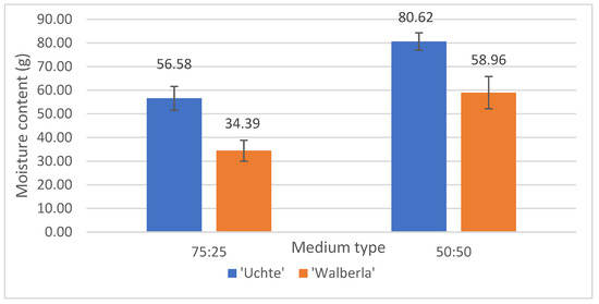 According to the moisture content (Figure 3), the F. glauca ‘Uchte’ variety had the highest value (80.62 g) on the 50:50 soil.