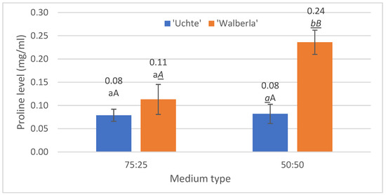 The proline level per plant, separated by soil type. The letters indicate the significance levels. ANOVA. By medium: 75:25: 0.375; 50:50: 0.01; by plant: ‘Uchte’: 0.898; ‘Walberla’: 0.041.