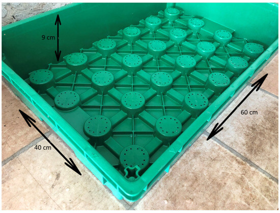 The experiment was carried out on a 5 m × 1 m plant table that simulated a roof garden, at the Budatétény site of the Hungarian University of Agriculture and Life Sciences. The layering typical of roof gardens was ensured by agro-fabric and unique modular green roof elements developed by Fito System Kft [69]. The modular roof garden elements were plastic trays with an area of 40 cm × 60 cm and a side wall of 9 cm (Figure 6).