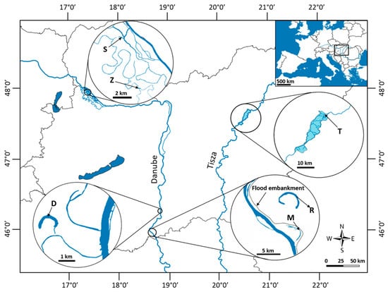 Plant material was collected from six aquatic habitats in Hungary, Central Europe (Figure 1). (i) Tisza Reservoir (T), also known as Lake Tisza, is an area of 127 km2 flooded by the dammed waters of Tisza River (47°40′12.00″ N, 20°45′30.18″ E). In this reservoir, a network of canals with constant water flow maintains the connection with the river. (ii) Schisler (S) and (iii) Zátonyi (Z) oxbows lie on the Szigetköz water plain, where many branches, islands and backwaters are spread between the main Danube channel and the Moson-arm (47°57′10.00″ N, 17°21′33.90″ E and 47°54′14.80″ N, 17°23′17.00″ E, respectively). Schisler has a direct, close connection with the Danube, which is 1.5 km away. The flow of water is intermittent but frequent. Zátonyi is part of the extensive branch system of the Szigetköz, far from the main river channel, with stagnant water. (iv) Decsi (D) and (v) Mocskos (M) oxbows are former Danube side branches lying on the floodplain of the Gemenc and Béda-Karapancsa Landscape Protection Areas (46°16′53.90″ N, 18°51′48.50″ E and 45°58′12.90″ N, 18°46′23.20″ E, respectively). Both can be temporarily connected to the Danube during the river’s floods, but with different frequencies. In the last fifty years, such an event has occurred only on a third of the days at Mocskos, and only on a sixth at Decsi []. (vi) Riha (R) is an isolated backwater on the protected side of the left bank of the Danube near Mohács (river km 1447), supported only by inland inundation (46°0′46.50″ N, 18°45′54.20″ E). The main hydrological differences in the six habitats are briefly summarized in Table 1.