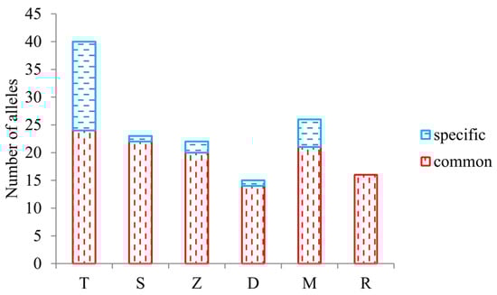 Distribution of alleles among the different classes in the backwaters. Common: detected in all backwaters; specific: detected in the given backwater only. T—Tisza Reservoir; S—Schisler; Z—Zátonyi; D—Decsi; M—Mocskos and R—Riha backwaters.
