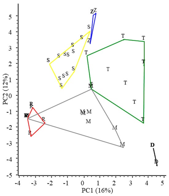 PCA ordination of C. demersum samples based on microsatellite allele frequency data. Convex polygons enclose plant samples collected from the same habitats. T—Tisza Reservoir; S—Schisler; Z—Zátonyi; D—Decsi; M—Mocskos and R—Riha backwaters.