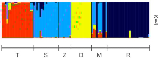 Bayesian assignment of individuals from 6 populations to genetic clusters inferred from the analysis of 9 microsatellite loci for K = 4. T—Tisza Reservoir; S—Schisler; Z—Zátonyi; D—Decsi; M—Mocskos and R—Riha backwaters. The plot represents each individual as a thin vertical bar. The proportion of each color in each column indicates the proportion of an individual’s genome being classified in any of the 4 clusters.