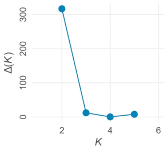The genetic structure of the populations was analyzed using the Bayesian clustering method []. The most probable number of genetically differentiated groups (K) in the populations was estimated and the individuals were assigned to these groups. Structure 2.3.4 was run to carry out these analyses using default settings, with an initial burn in of 100,000 steps and running length of 500,000 steps. In the evaluation of the results, ΔK was computed, which indicates the change in log probability between successive K values []. The package ‘pophelper’ in R [] was applied to compute the ΔK values, average the ten runs of the most probable K value given by Structure, and correct for label switching.
