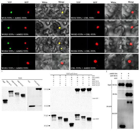 To further examine the interaction between the AtMS2 and WUS/WOX proteins, a bimolecular fluorescence complementation (BiFC) assay was performed in leaf epidermal cells of Nicotiana benthamiana. The Coilin:RFP protein was transiently expressed in epidermal cells as a nucleus marker [33]. Strong fluorescence of YFP and RFP was observed in the nucleus of many epidermal cells when AtMS2 in fusion with the C-terminal half of YFP (AtMS2-YFPC) and WUS in fusion with the N-terminal half of YFP (WUS-YFPN), as well as Coilin:RFP protein, were transiently co-expressed in Nicotiana benthamiana epidermal cells (Figure 2a). Therefore, AtMS2 might interact with WUS in the nucleus. AtMS2 also interacted with WOX5 and WOX4 in the nucleus of leaf epidermal cells in the BiFC assay (Figure 2b,c), while it failed to interact with WOX1, which is another member of the WOX family (Figure 2d). YFP fluorescence was not observed in negative control assays either (Figure 2e–h). The interaction between AtMS2 and WUS/WOX was further examined by an in vitro pull-down assay. The results showed that the purified AtMS2 protein fused with GST can directly interact with MBP:WUS, MBP:WOX5, and MBP:WOX4 proteins but not with the MBP protein (Figure 2i). In addition, the AtMS2 protein was demonstrated to interact with the WUS protein in Nicotiana benthamiana epidermal cells in a co-immunoprecipitation assay (Co-IP) (Figure 2j). Taken together, the above results demonstrated that AtMS2 can directly interact with WUS, WOX5, and WOX4.