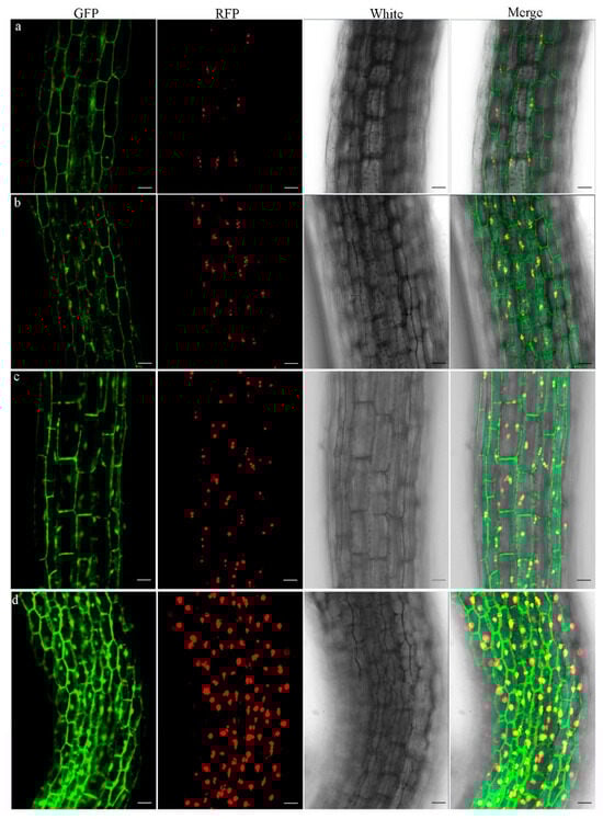 GFP fluorescence, YFP fluorescence, and RFP fluorescence were examined using a confocal laser scanning microscope (Zeiss LSM 780, Jena, Germany) with excitation/emission values of 488 nm/495–545 nm, 513 nm/495–545 nm and 561 nm/578–636 nm, respectively. The laser intensity was usually set between 700 and 800.