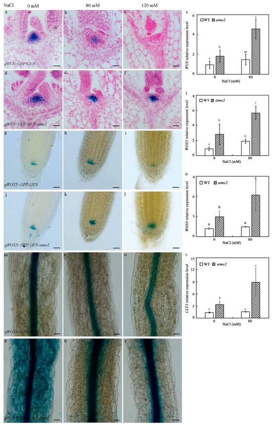 AtMS2 represses WUS/WOX expression under salt stress. (a–f) The expression of WUS:GFP:GUS protein is decreased to a lower level in 7-day-old gWUS::GFP:GUS seedlings (a–c) in comparison with gWUS::GFP:GUS atms2 seedlings (d–f) grown on media containing 80 mM (b,c) and 120 mM NaCl (c,f), respectively. (g–l) WOX5:GFP:GUS protein is expressed at a higher level in 7-day-old gWOX5::GFP:GUS atms2 seedlings (j–l) in comparison with gWOX5::GFP:GUS seedlings (g–i) grown on media containing 80 mM (h,k) and 120 mM (i,l) NaCl, respectively. (m–r) WOX4:GFP:GUS protein is expressed at a higher level in 7-day-old gWOX4::GFP:GUS atms2 seedlings (p–r) in comparison with gWOX4::GFP:GUS seedlings (m–o) grown on media containing 80 mM (n,q) and 120 mM (o,r) NaCl, respectively. Scale bar = 50 µm (a–f), 25 µm (g–l), and 200 µm (m–r). (s–v) The RT-qPCR analysis of WUS (s), WOX5 (t), WOX4 (u), and CLV3 (v) mRNA in 5-day-old WT and atms2 mutant grown on medium containing 80 mM NaCl. Actin2 was examined as a reference gene. Error bar = mean ± SD (n = 3). Statistical differences (p ≤ 0.01) between different plants were determined by one-way ANOVA followed by Tukey’s multiple comparison test.