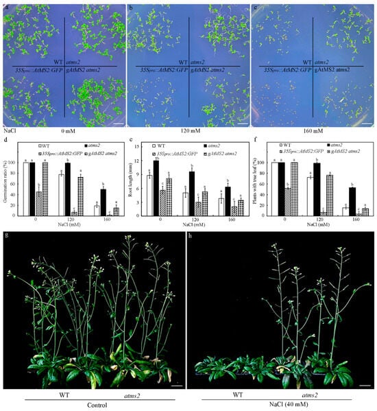 The same 7.324 Kb AtMS2 genomic sequence used for the gAtMS2::GFP:GUS construct was also used to create the gAtMS2 construct, which was introduced into the atms2 mutant for the complementation test. The germination and growth of 7-day-old WT, atms2, gAtMS2 atms2, and 35Spro::AtMS2:GFP seedlings on media containing NaCl at different concentrations were examined. After sowing on the control MS medium for 7 days, the germination ratio of the 35Spro::AtMS2:GFP seed was clearly lower than that of the WT, atms2, and gAtMS2 atms2 seeds (Figure 5a,d), suggesting the nuclear localization of AtMS2:GFP protein even under normal growth conditions. On the MS medium containing 120 mM NaCl, the germination ratio of the 35Spro::AtMS2:GFP seedling was more strongly reduced in comparison with other seedlings, suggesting that the overexpression of AtMS2 protein causes hypersensitivity to salt stress (Figure 5b,d). On the medium containing 160 mM of NaCl, the germination ratio of atms2 was higher than that of WT and gAtMS2 atms2, demonstrating that atms2 was insensitive to salt stress (Figure 5c,d). When 2-day-old WT, atms2, gAtMS2 atms2, and 35Spro::AtMS2:GFP seedlings grown on control MS media were transferred to MS media containing NaCl at different concentrations for another 5 days, atms2 mutants had longer primary roots and a higher percentage of seedlings with true leaves than that of the WT and gAtMS2 atms2 seedlings, while the 35Spro::AtMS2:GFP seedling exhibited the opposite phenotypes (Figure 5e,f and Figure S4). These results demonstrated that AtMS2 represses plant growth and development under salt stress. To examine the effects of long-term NaCl treatment on the growth and development of the atms2 mutant, the WT and atms2 mutant were grown on soil and watered with 40 mM NaCl once per week. After a two-month NaCl treatment, the inflorescent shoot development of WT was clearly suppressed, while the inflorescent shoot of the atms2 mutant grew up and produced flowers as those of the control plants under normal growth conditions (Figure 5g,h). Therefore, the loss of function of AtMS2 enhanced the salt tolerance of Arabidopsis.