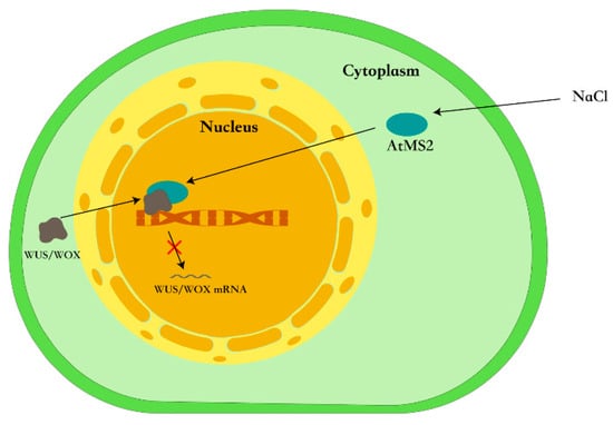 A proposed model for the repression of WUS/WOX gene by AtMS2 in response to salt stress. Salt stress induces the nuclear translocation of AtMS2, which further binds to the WUS/WOX promoter and represses WUS/WOX expression by interacting with WUS/WOX.
