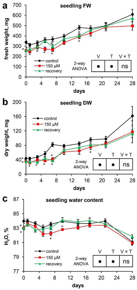 The development of Scots pine seedlings throughout the experiment: (a) fresh weight; (b) dry weight; and (c) water content. Pairwise comparisons of the means with controls at corresponding time points were performed using the Student’s t-test for normally distributed data (significant differences at p < 0.05 denoted by asterisks (*)) or the Mann–Whitney rank sum test when the t-test was not applicable (significant differences at p < 0.05 denoted by multiplication symbols (×)). The significance of the variant (V), sampling time (T), and variant × time (V × T) interactions were calculated using 2-way ANOVA (p < 0.05), with a circle (•) indicating a significant difference and “ns” indicating no significant difference.