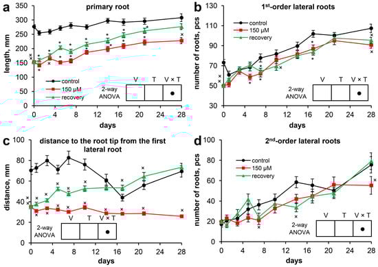 The development of the root system of Scots pine seedlings throughout the experiment: (a) primary root length; (b) number of first-order lateral roots; (c) distance from the tip of the primary root to the first lateral root; and (d) number of second-order lateral roots. Pairwise comparisons of the means with controls at corresponding time points were performed using the Student’s t-test for normally distributed data (significant differences at p < 0.05 denoted by asterisks (*)) or the Mann–Whitney rank sum test when the t-test was not applicable (significant differences at p < 0.05 denoted by multiplication symbols (×)). The significance of the variant (V), sampling time (T), and variant × time (V × T) interactions were calculated using 2-way ANOVA (p < 0.05), with a circle (•) indicating a significant difference.