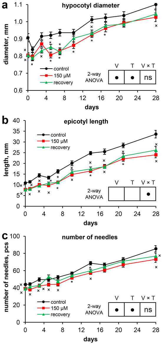 The growth of the above-ground organs of Scots pine seedlings throughout the experiment: (a) hypocotyl diameter; (b) epicotyl length; and (c) number of needles. Pairwise comparisons of the means with controls at corresponding time points were performed using the Student’s t-test for normally distributed data (significant differences at p < 0.05 denoted by asterisks (*)) or the Mann–Whitney rank sum test when the t-test was not applicable (significant differences at p < 0.05 denoted by multiplication symbols (×)). The significance of the variant (V), sampling time (T), and variant × time (V × T) interactions were calculated using 2-way ANOVA (p < 0.05), with a circle (•) indicating a significant difference and “ns” indicating no significant difference.