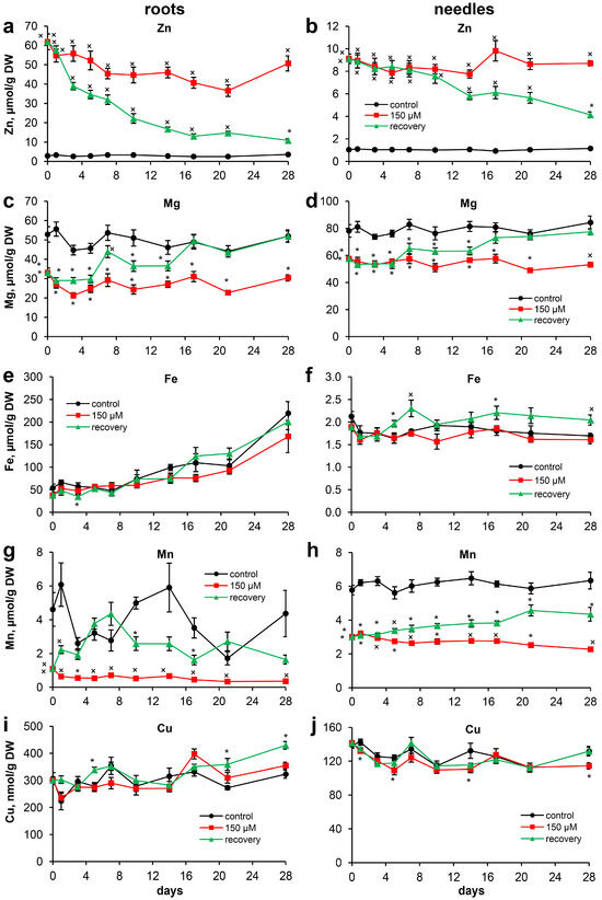 The nutrient contents: (a,b) Zn; (c,d) Mg; (e,f) Fe; (g,h) Mn; and (i,j) Cu in the roots (a,c,e,g,i) and needles (b,d,f,h,j) of Scots pine seedlings throughout the experiment. Pairwise comparisons of the means with controls at corresponding time points were performed using the Student’s t-test for normally distributed data (significant differences at p < 0.05 denoted by asterisks (*)) or the Mann–Whitney rank sum test when the t-test was not applicable (significant differences at p < 0.05 denoted by multiplication symbols (×)).