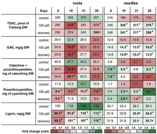 Heatmap analysis of low-molecular-weight antioxidant and lignin contents in the roots and needles of Scots pine seedlings during the experiment. The value of a given parameter in the control plants at the initial point was taken as 1.0 (white); the relative increase is indicated in green, and the relative decrease is indicated in red. Pairwise comparisons of the means with controls at corresponding time points were performed using the Student’s t-test for normally distributed data (significant differences at p < 0.05 denoted by asterisks (*)) or the Mann–Whitney rank sum test when the t-test was not applicable (significant differences at p < 0.05 denoted by multiplication symbols (×)).