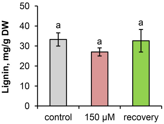 An increase in lignin content in response to excess metals (Cu, Zn, Cd, Mn, and Al) has been noted for many plant species [33,34]. However, several reports indicate that lignin biosynthesis is not a universal plant response to TMs. For example, Cd and Pb at the same concentrations had opposite effects on lignin accumulation in the roots of soybean and lupine plants [35]. Environmental pollution led to an increase in the lignin content in Scots pine wood but did not affect the lignin content in Quercus robur L. wood [36].