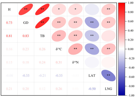 Correlation coefficient among plant traits, longitude, and latitude. The lower left corner is the correlation coefficient. The red font indicates a positive correlation and the blue font indicates a negative correlation. The color of the font indicates the strength of the correlation: the deeper the color, the stronger the correlation. The upper right corner is a highly significant level. The red indicates a positive correlation and blue indicates a negative correlation. The elliptical eccentricity size and the color depth indicate the correlation strength: the greater the elliptical eccentricity, the deeper the color, the stronger the correlation. * indicates p less than 0.05 and ** means p less than 0.01. The right color column represents the correlation coefficient. Presented here are the latitude, the longitude (LNG), the height (H), the ground diameter (GD), the total biomass (TB), the carbon isotope composition (δ13C), and the nitrogen isotope composition (δ15N).
