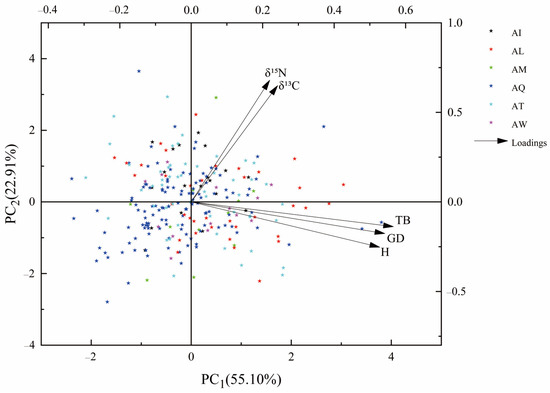 PCA analysis of 256 genotypes in 6 provenances. The x-axis and y-axis represent principal component 1 (PC1) and principal component 2 (PC1) with the proportions. Presented here are the following: height (H), ground diameter (GD), total biomass (TB), carbon isotope composition (δ13C), nitrogen isotope composition (δ15N), Iowa America (AI), Louisiana America (AL), Missouri America (AM), Tennessee America (AT), Quebec Canada (AQ), and Washington America (AW).