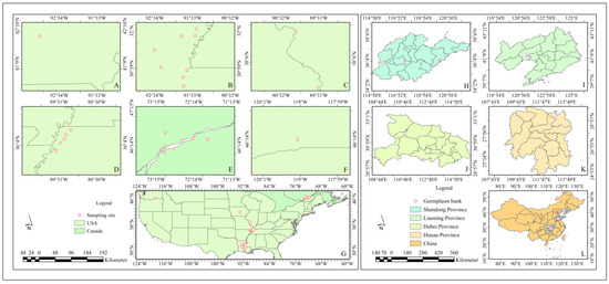 Distribution of provenances and genebanks. The areas marked (A–F) are the geographical locations of the sampling points of the six provenances of P. deltoides: (A) Iowa, America (AI); (B) Louisiana, America (AL); (C) Missouri, America (AM); (D) Tennessee, America (AT); (E) Quebec, Canada (AQ); and (F) Washington, America (AW). The area marked (G) is the distribution of the sampling points in the USA and Canada, and the legend, the compass, and the scale are on its left side. The areas marked (H–K) are the geographical locations of the germplasm resources of P. deltoides: (H) Ningyang Gaoqiao Forest Farm; (I) Daling-river Forest Farm; (J) Shishou Poplar Research Institute; (K) Junshan Forest Farm. The area marked (L) is the distribution of the germplasm resources in China, and the legend, the compass, and the scale are on its left side.