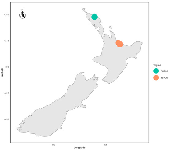 The vine data on budbreak and flowering were combined with climate data from the weather station closest to each experimental site. Data from the weather station closest to each study location were extracted from the MetWatch (http://www.metwatch.co.nz (accessed on 20 March 2024)) and NIWA (www.cliflo.niwa.co.nz, via R package “clifro” (accessed on 4 April 2024)) weather databases, and when multiple stations were available, the station with the most complete data was used. Figure 1 shows the locations of the two main study regions.