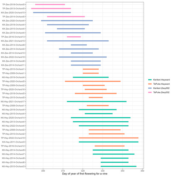 The range of first flowering days (as day of the year) for vines of both kiwifruit cultivars in different orchards/regions over years. Spring is in September in New Zealand. From the top to the bottom, the data were ordered based on the mean day of year of the first flowering for the vine. The first two letters on the orchard name indicate the region of the orchards (KK = Kerikeri, TP = Te Puke), followed by the cultivar (Hay = ‘Hayward’, Zes = ’Zesy002’), study year, and the orchard names, which are anonymized and labeled by numbers.