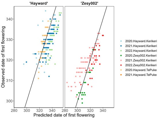The mean flowering day predicted by the selected model for the single kiwifruit orchard at Kerikeri (Orchard 4 as in Figure 2 and Table S1) comparing the observations within the test data. The predictive variables included in the model are cultivar, growing degree day accumulation at predicted 5% budbreak date, and degree day accumulation on 1 September.